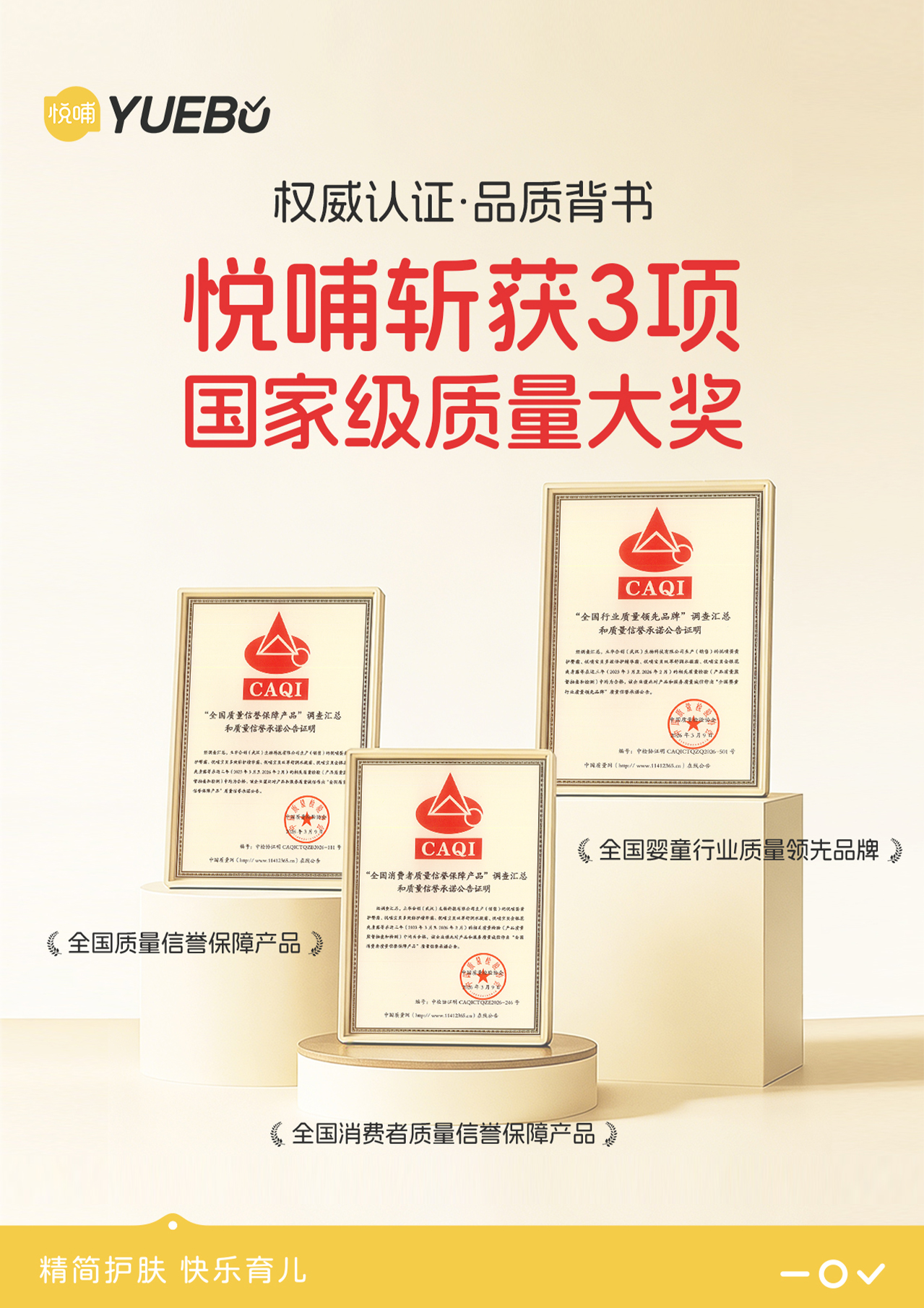 在刚刚过去的2026年3·15国际消费者权益日期间,婴童护肤品牌悦哺凭借产品品质与诚信经营理念,经相关审核与评定,荣获中国质量检验协会颁发的三项重量级荣誉:“全国婴童行业质量领先品牌”、“全国消费者质量信誉保障产品”及“全国质量信誉保障产品”。这不仅标志着悦哺在婴童护肤领域的质量基石获得行业层面的高度认可,更彰显了其积极响应中国质量检验协会“产品和服务质量诚信承诺”主题活动、主动承担质量主体责任的品牌担当。