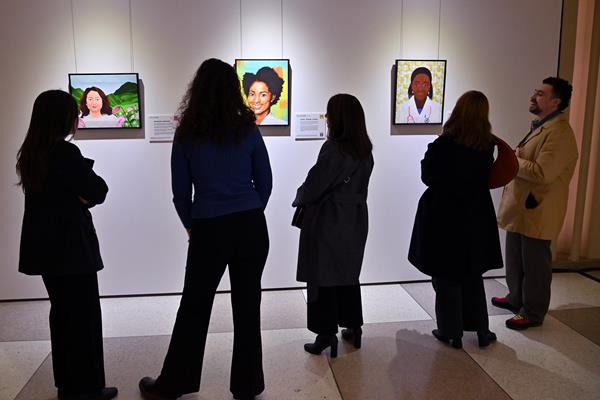 Nearly a dozen of the women featured were present for the unveiling. The artwork was created by three women artists: Gayle Kabaker, Stef Wong, and Erin K. Robinson. (Click here to view and download photos from the opening featuring global women leaders featured in the portraits.)